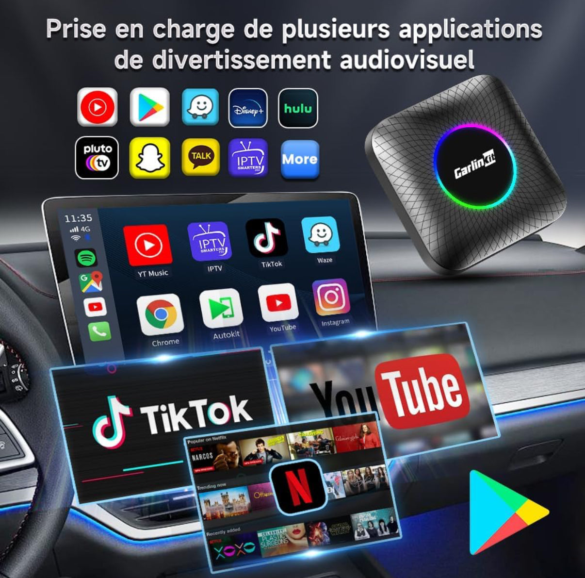Transformez l’écran de votre voiture en une interface intelligente et connectée avec cette box multimédia Android 13. Dotée d’un processeur Qualcomm 8 cœurs, elle prend en charge CarPlay sans fil et Android Auto sans fil pour une connexion fluide avec votre iPhone ou smartphone Android. Profitez de vos applications préférées comme Netflix, YouTube et bien d’autres directement depuis votre écran grâce au Google Play Store intégré.